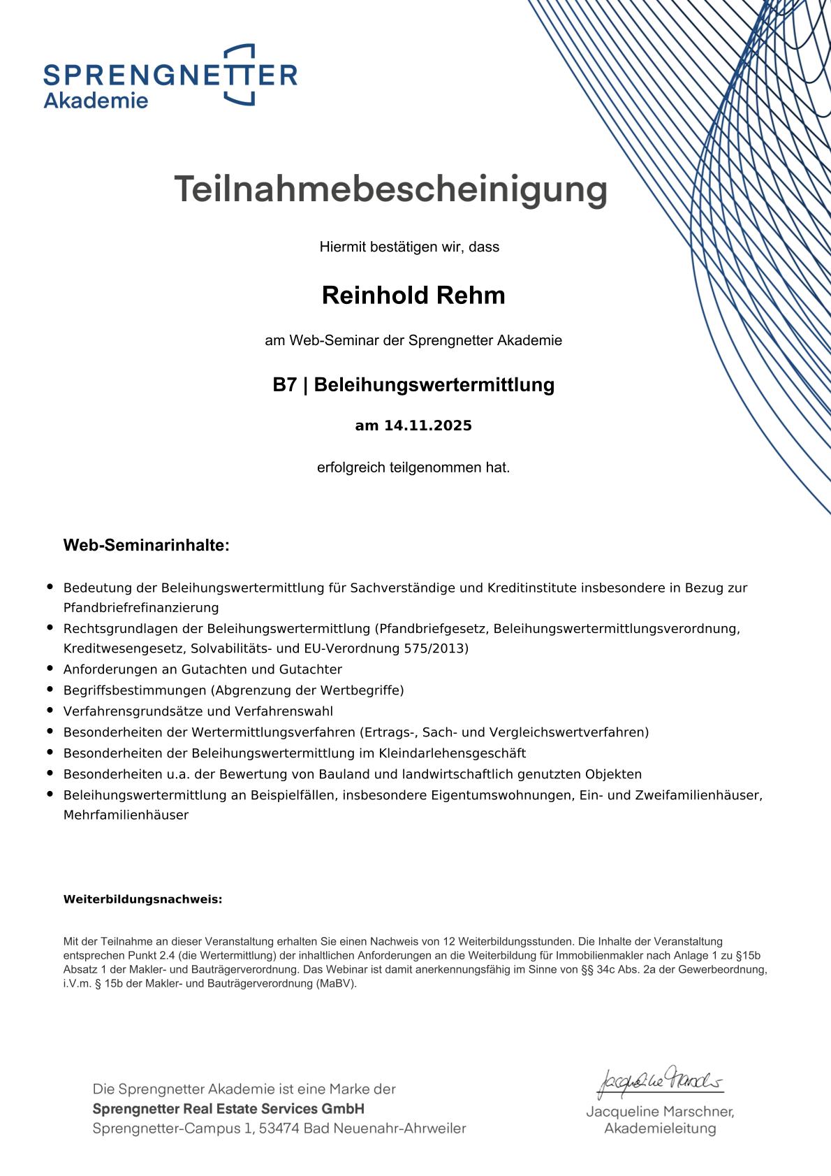 Reinhold Rehm hat beim TÜV Rheinland Weiterbildungen zum Immobilienwertermittler sowie zum Sachverständigen für Immobilienwertermittlung abgeschlossen. Zusätzlich ist er von der IHK als geprüfter Immobilienmakler zertifiziert und Mitglied im Bundesverband deutscher Grundstückssachverständiger und im Bundesverband deutscher Sachverständiger und Fachgutachter e.V.. Alle entsprechenden Nachweise und Zertifikate finden Sie rechts im Überblick.